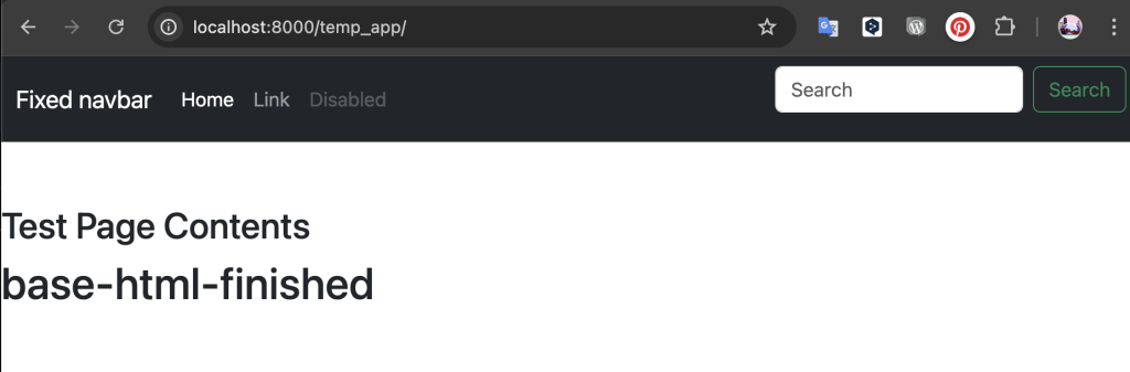 Now let’s start by adding these two source url addresses into base.html. Also, let’s copy <style>…</style> from the source code of Bootstrap/Navbar Fixed page and <nav>…</nav> in the body block into base.html.