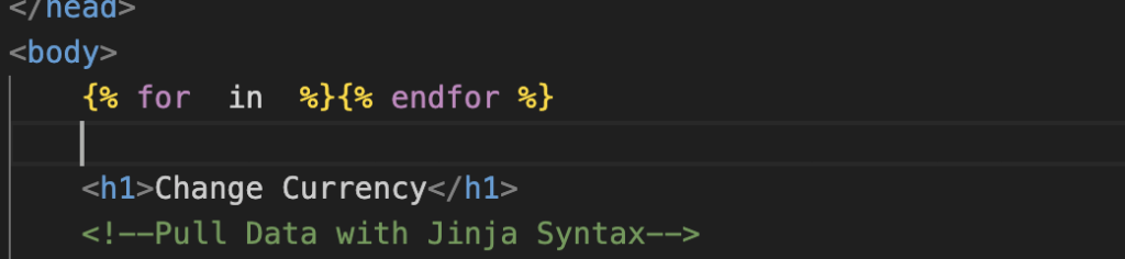The data sent from the python file can be printed on the page by writing the data keys with Django with Jinja Syntax in the html page. For this we will make use of {{ }} curly brackets. Let’s see it typed in currency.html.