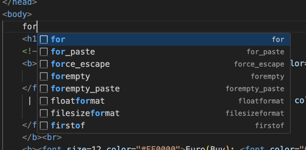 After installing the Django Expansion Pack in VS Code, when you type for for example as above, the usage method will be automatically printed between the Html tags as follows.