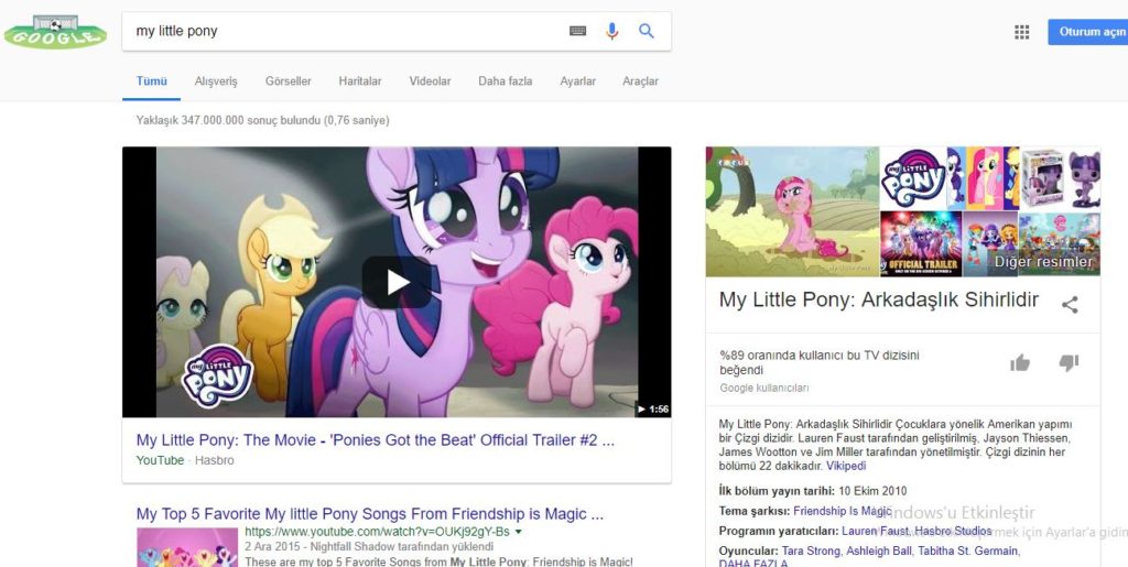 When you search for a movie, a magazine or, as in the example below, a cartoon character, let’s see what kind of page Google will prepare for you. When I type“My little ponny” in the Google search box, the YouTube content with the most likes and views comes first on the left, with images on the right and like ratings below that.